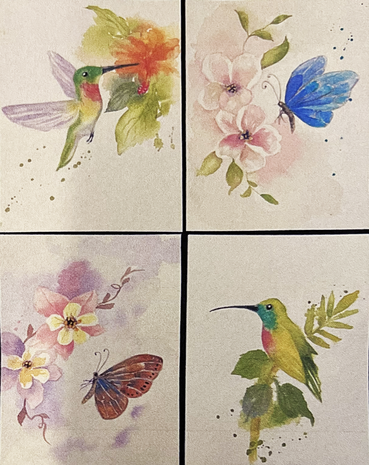 Learn how to paint four spring cards or keep as small paintings. Learn to paint delicate pedals, leaves, hummingbirds and butterflies with soft backgrounds. Learn how to mix colors from light to darker tones and how to apply paint to your painting. You will receive a lesson handout and watch demonstration steps on the painting process.