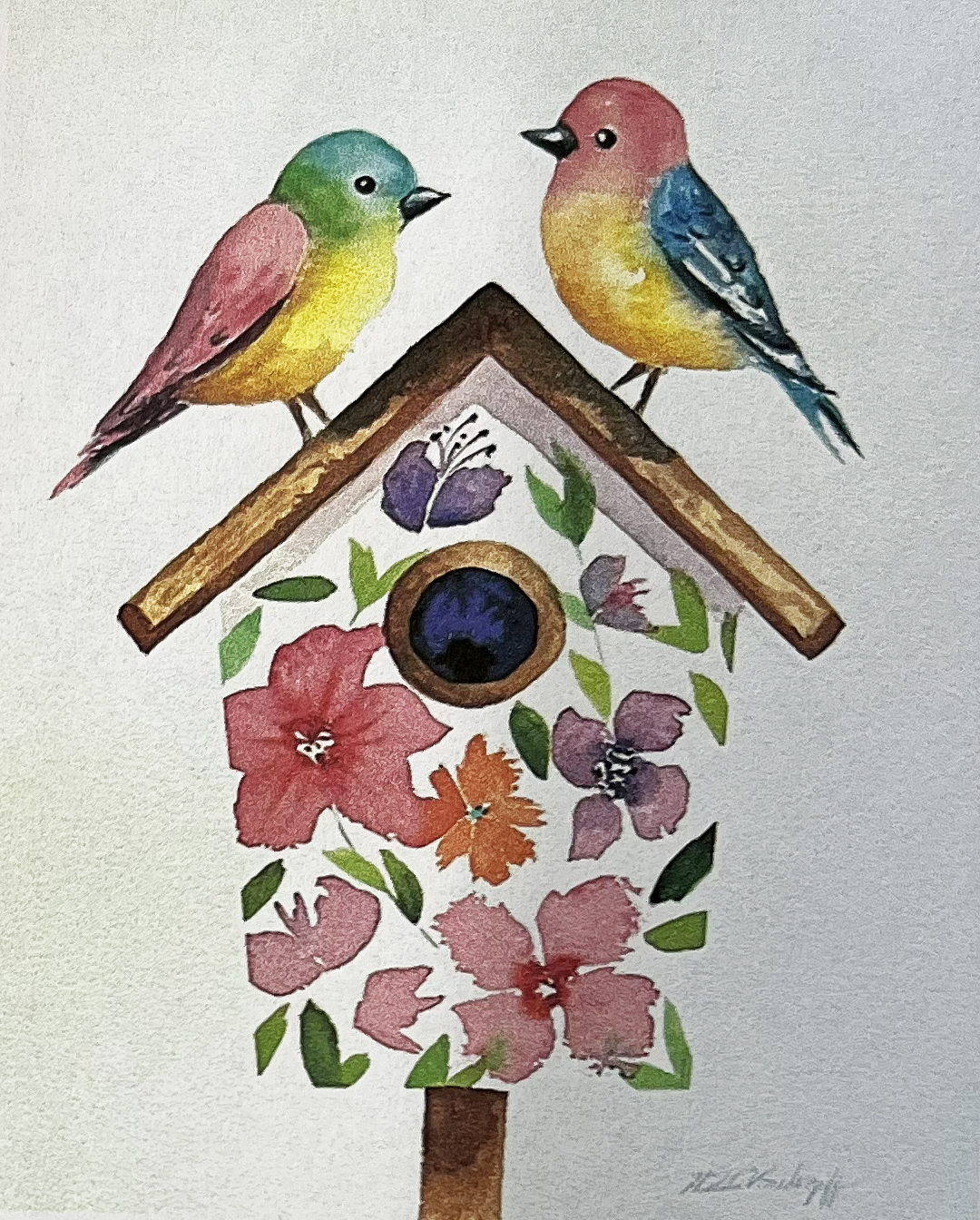 Learn how to paint colorful birds on a birdhouse with watercolors. Get creative with your own unique pattern on your birdhouse. Learn how to mix colors from light to darker tones and how to apply paint to your painting. You will receive a lesson handout and watch demonstration steps on the painting process.