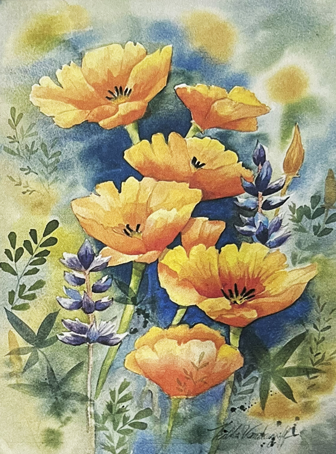 Learn how to paint California Poppies and Lupine with foliage and a background. How to use complimentary colors and use your brush to create the extra foliage in the background. You will receive a lesson handout and watch demonstration steps on the painting process.