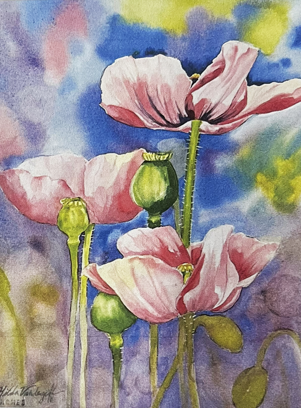 Learn how to paint pink poppies, buds, and stems with a background. Learn how to lift color out, where to keep darker values, and mix colors. You will receive a lesson handout and watch demonstration steps on the painting process.
