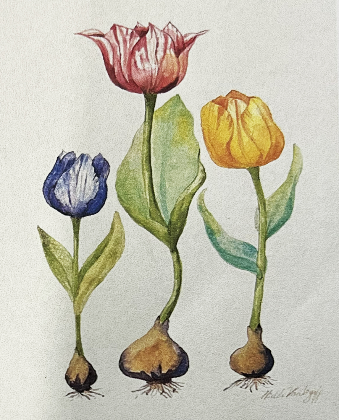 Learn how to paint a tulips botanical style watercolor painting. Learn to paint delicate pedals, long stems with leaves and bulbs. Mix colors from light to darker tones and how to apply paint to your painting. You will receive a lesson handout and watch demonstration steps on the painting process.