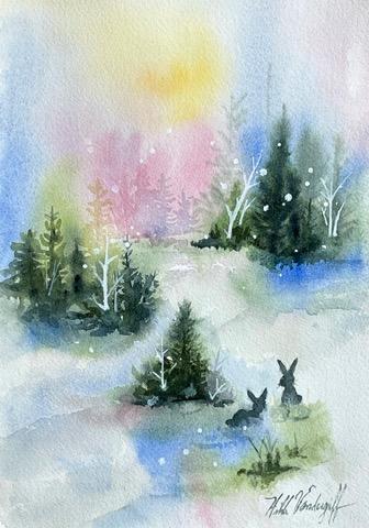 Learn to paint a winter landscape with trees, snow and a couple of bunnies. Learn to mix colors, how to blend, how to apply, where to have contrast and values all with watercolor paint. This is a class for anyone no experience required. Come have fun painting and learn about watercolors.